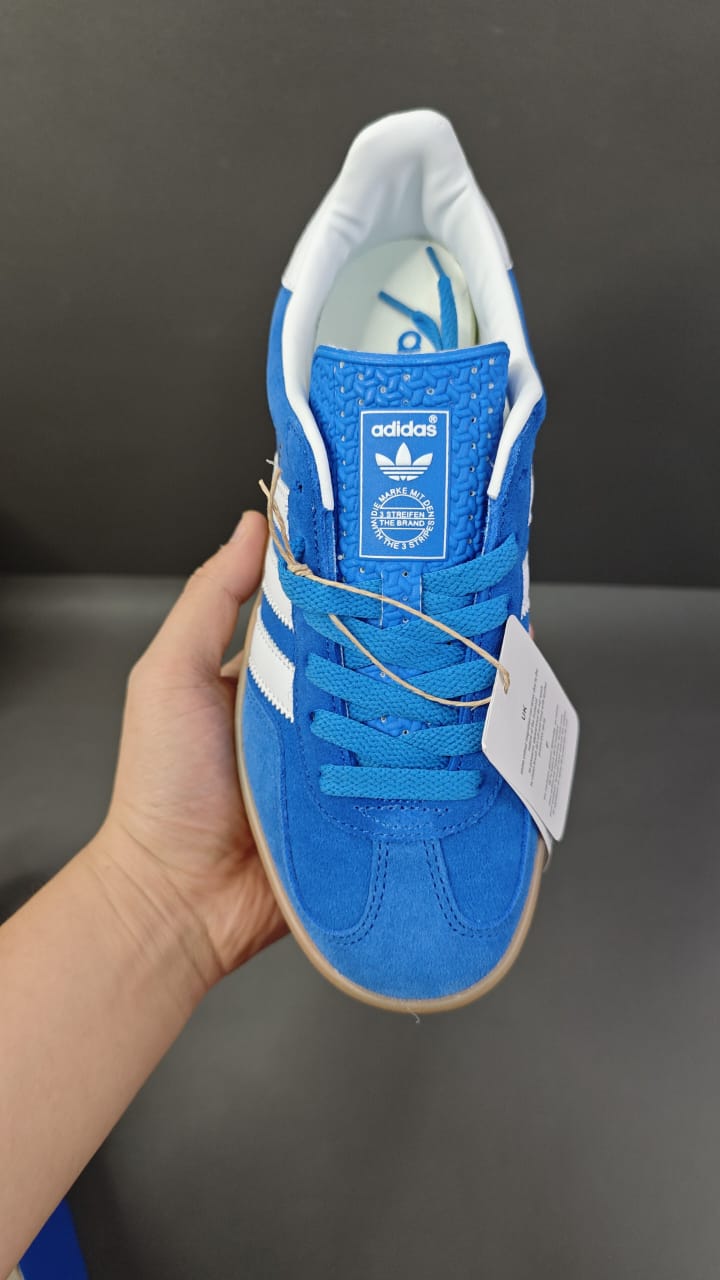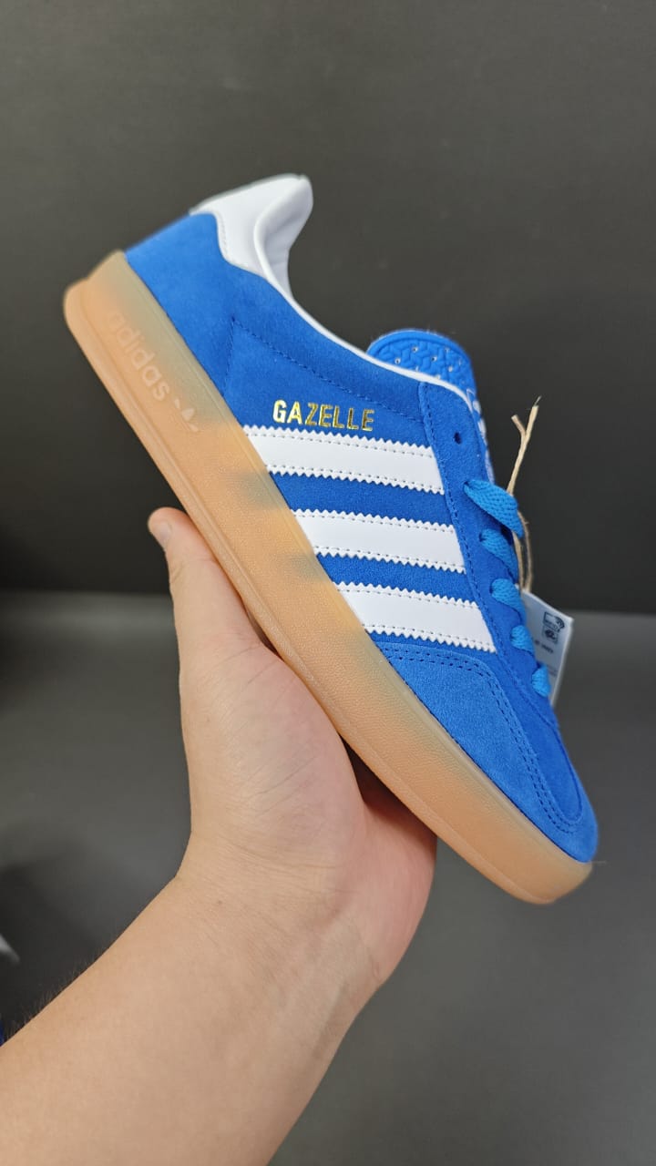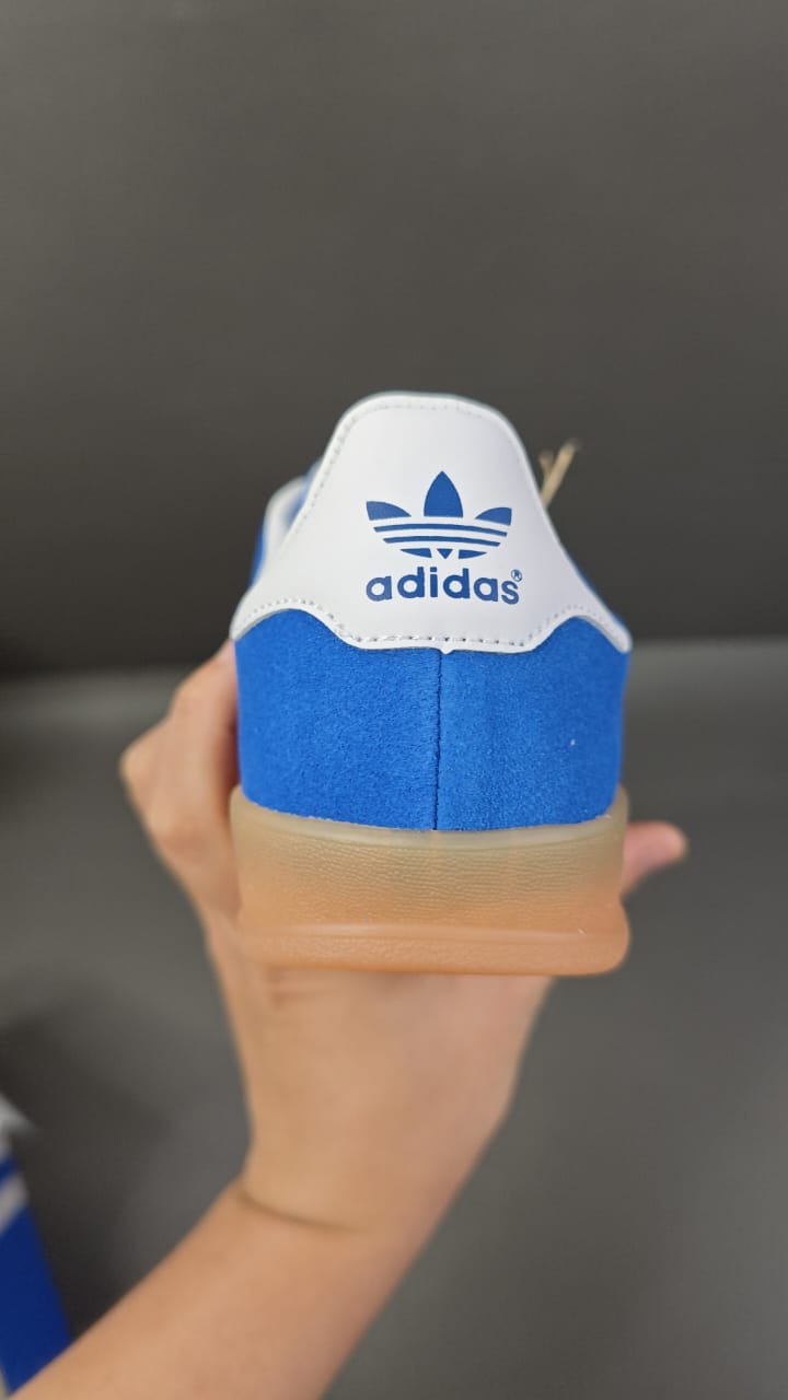 O Adidas Gazelle Indoor Blue White Gum mantém o estilo retrô clássico da linha Gazelle, agora com um toque moderno e versátil. O cabedal em camurça azul premium com as icônicas três listras brancas garante um visual elegante e autêntico. A sola de borracha translúcida tipo “gum” completa o design com um acabamento vintage que combina com qualquer ocasião.